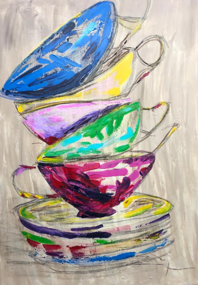 “Kop en schotels” – acryl op doek – Sylvia Melssen