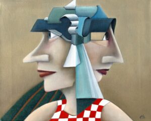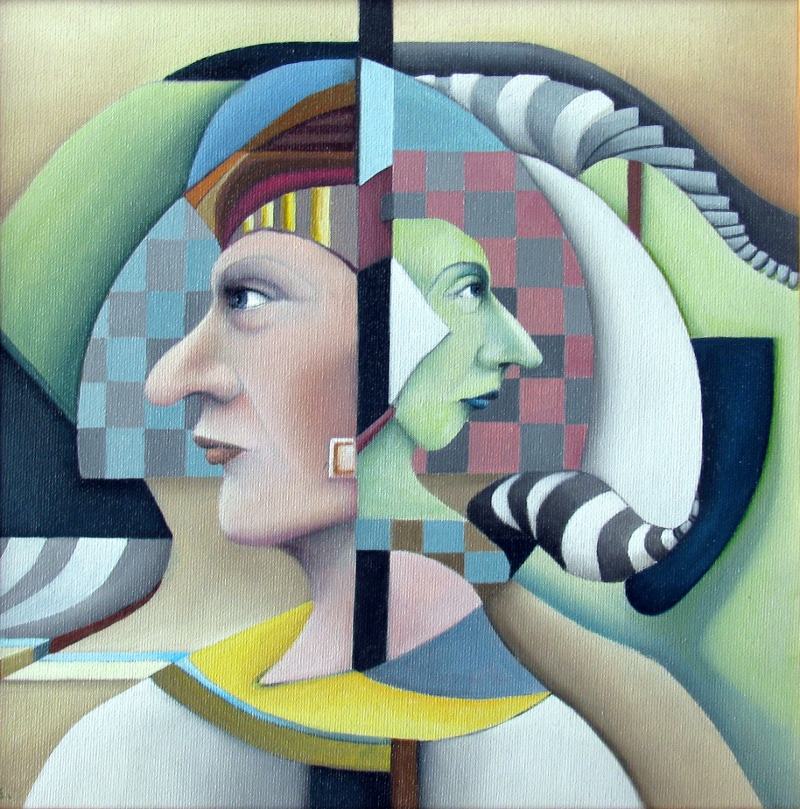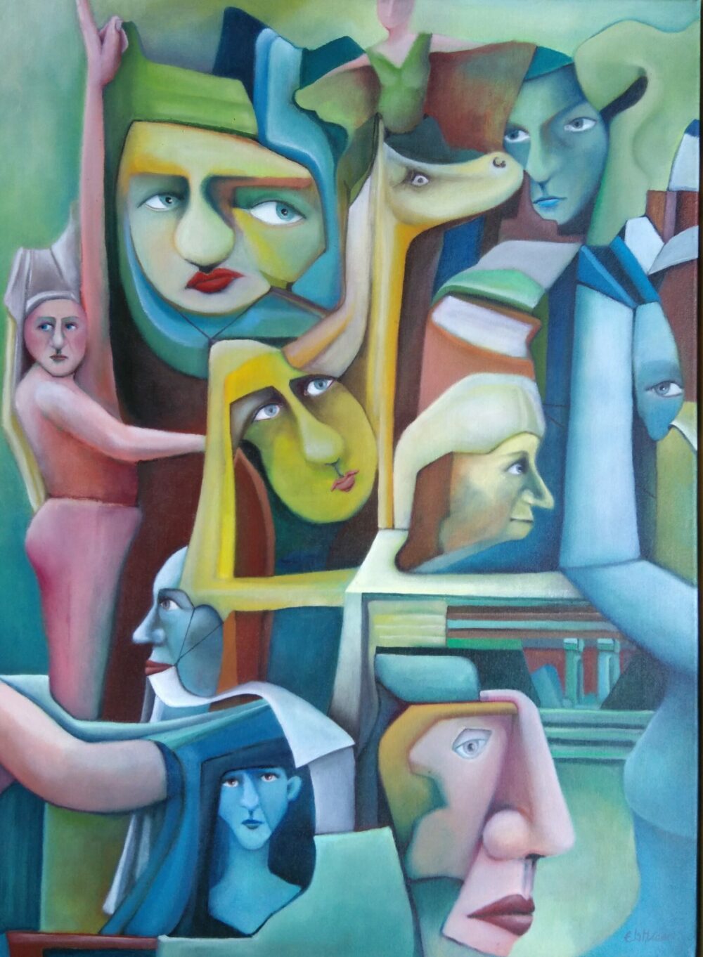 Hierbij ga ik uit van een of meerdere horizontale, verticale of diagonale strepen en ga daaromheen hoofden construeren.